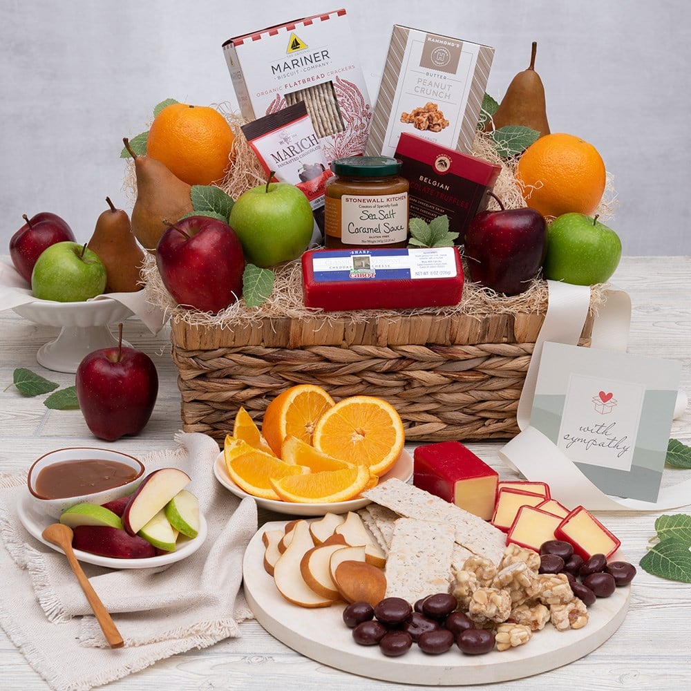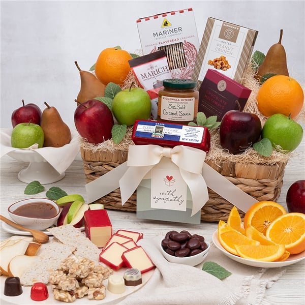 The With Sympathy Fruit and Snack Gift Basket includes: